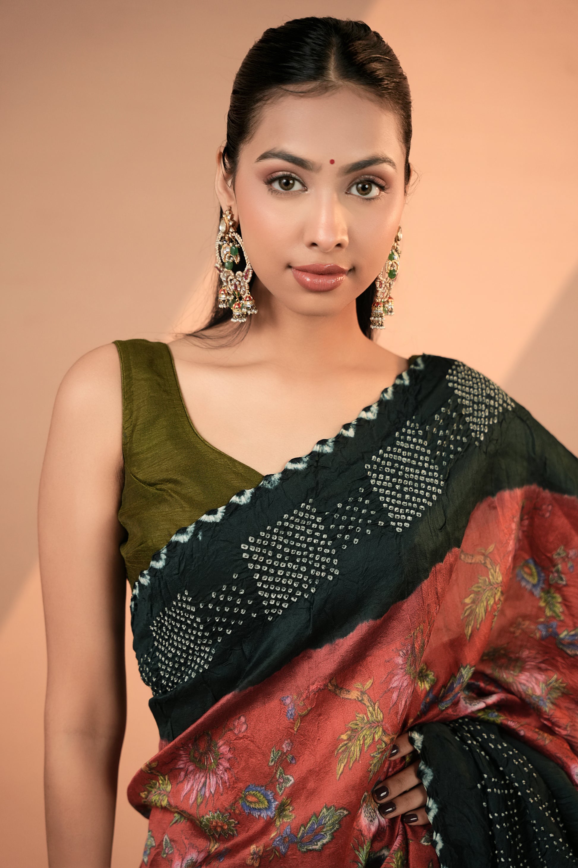 Shyamli - A graceful Pure Chiniya Silk Saree, featuring vibrant Bandhani work paired with digitally printed border and pallav. Soft in texture and rich in design, this drape brings together traditional charm and contemporary flair.