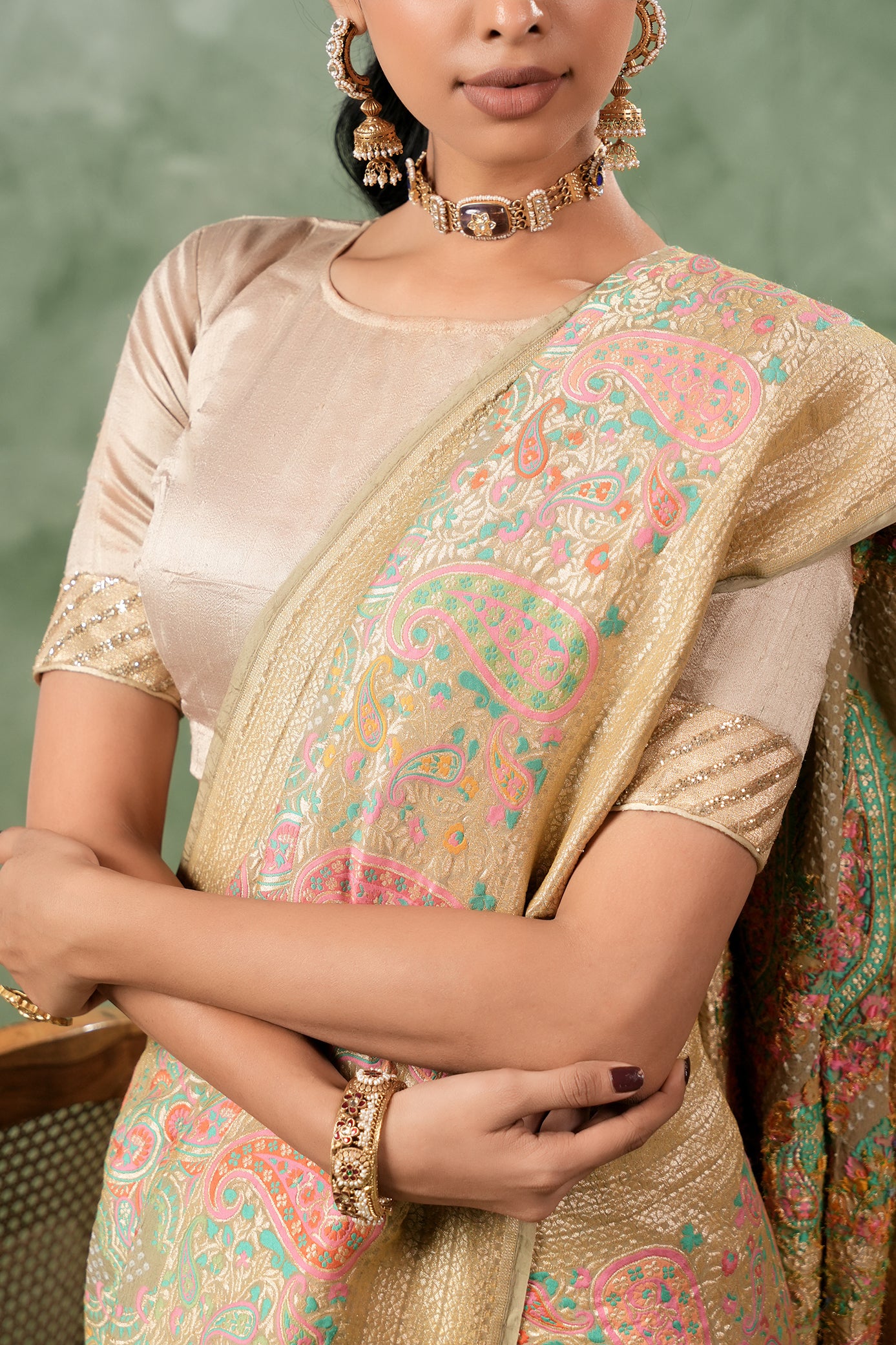 Manjari - A soft Pastel Beige Pure Handwoven Georgette Saree, featuring delicate Marva weaving inspired by mango blossoms and multicolor Bandhej. Light, graceful, and rooted in tradition — a serene drape that celebrates blooming elegance in every thread.
