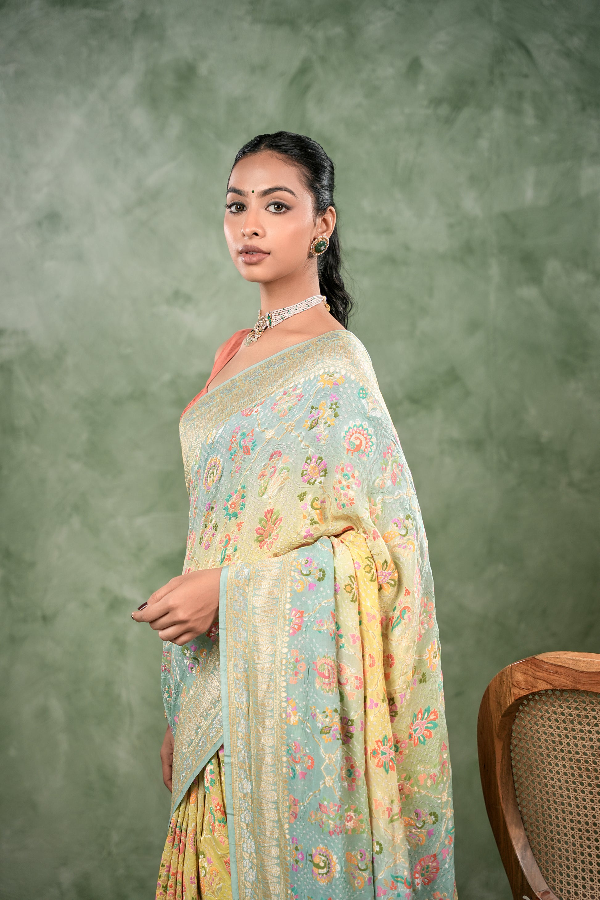Tarangini - A soft Pastel Yellow & Blue Pure Banarasi Georgette Saree, featuring all-over Meenakari motifs of peacocks and flowers, beautifully paired with Rai Bandhej detailing. Finished with tested Zari, this drape blends delicate tones with timeless craftsmanship.
