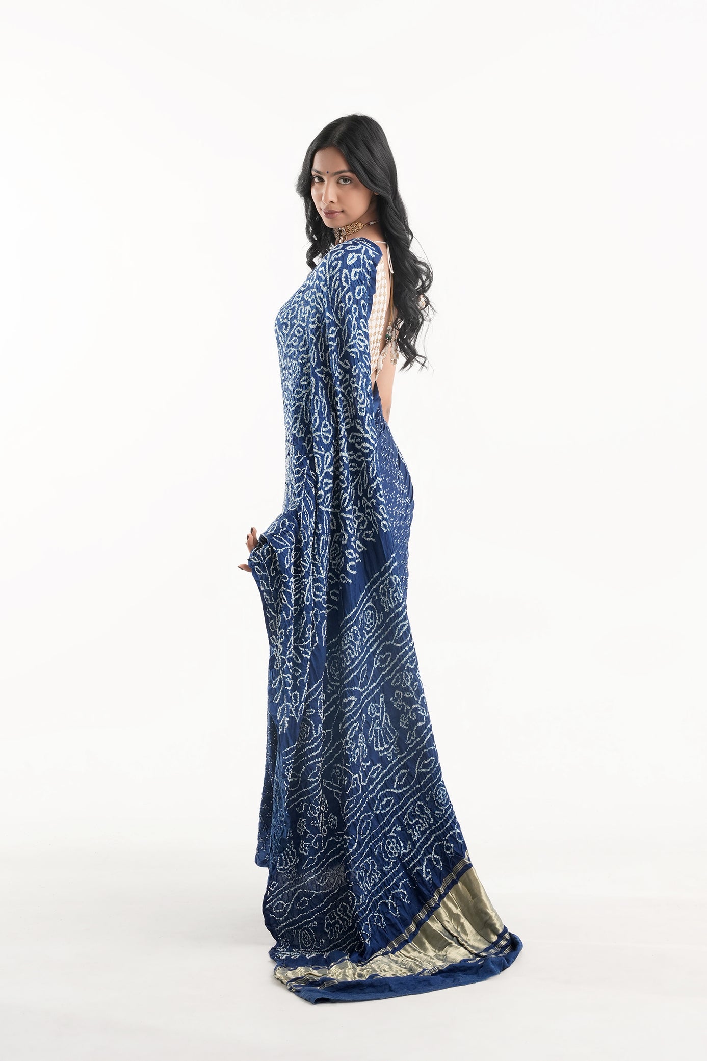 Nilaya - A striking Navy Blue Pure Gajji Silk Saree, featuring handcrafted Ambadal Bandhej and a classic Lagdi Patta finish. The rich texture and intricate tie-dye work blend tradition with effortless elegance — a timeless drape that speaks in silence.
