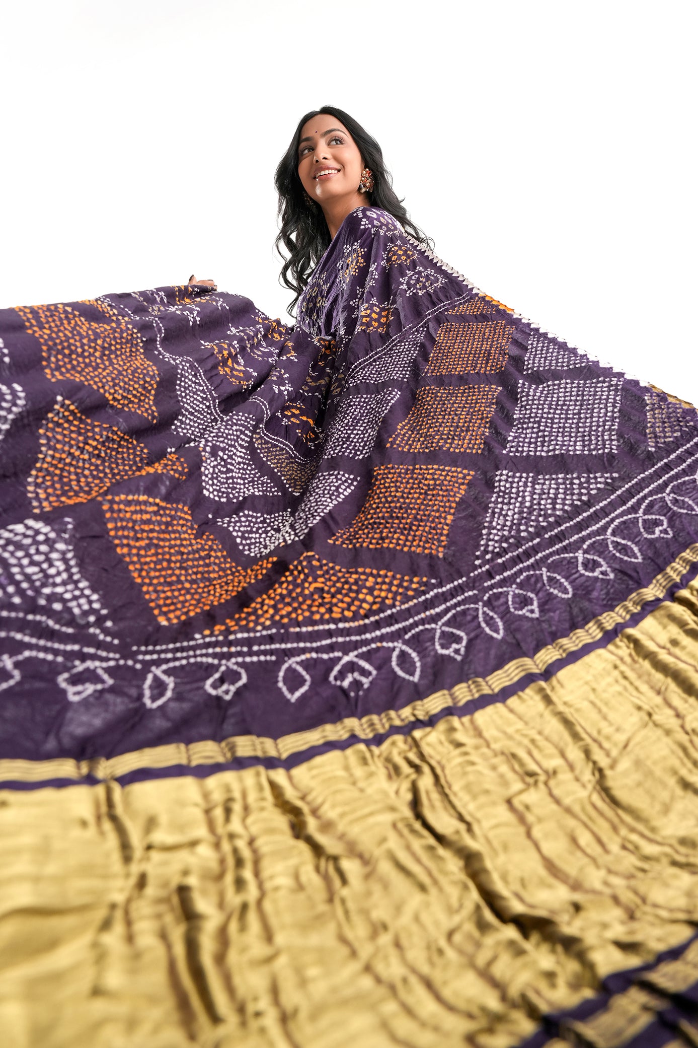 Ravya - A vibrant Purple & Mustard Pure Gajji Silk Saree, featuring sun-ray inspired Bandhej motifs that radiate warmth and strength. With its rich texture and bold hues, this drape embodies the glow of tradition, power, and timeless poise.